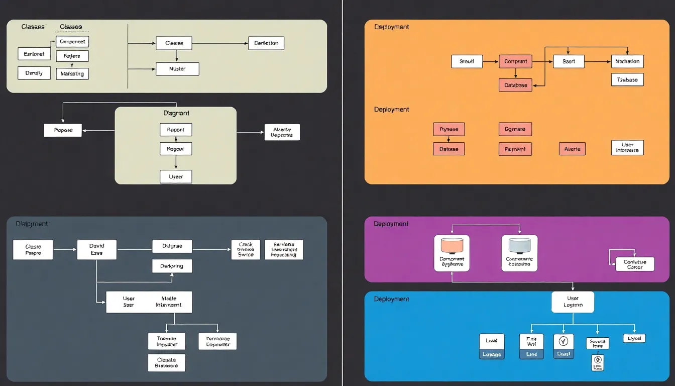 Activity diagrams model dynamic aspects, depicting workflows and process structures. Component diagrams visualize the parts of a system in terms of components and their interfaces. Deployment diagrams illustrate the physical deployment of artifacts, helping teams understand runtime configurations.